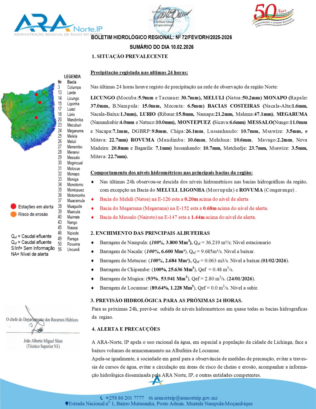 🚨As Bacias Hidrográficas de Meluli-Natoa, Megaruma-Megaruma e Messalo-Naitoto na região-Norte do país, apresentam níveis hidrométricos acima do nível de alerta, e nas próximas 24h, prevê-se subida de níveis hidrométricos em quase todas bacias da região.